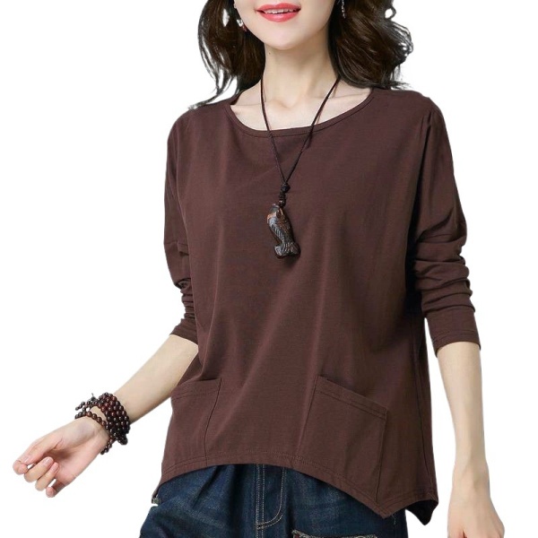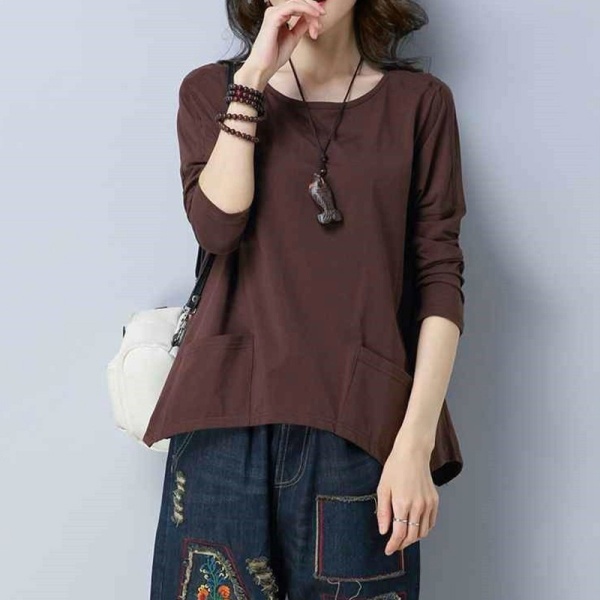 纯色大码女装设计感口袋长袖t恤女秋装2025新款宽松复古简约上衣