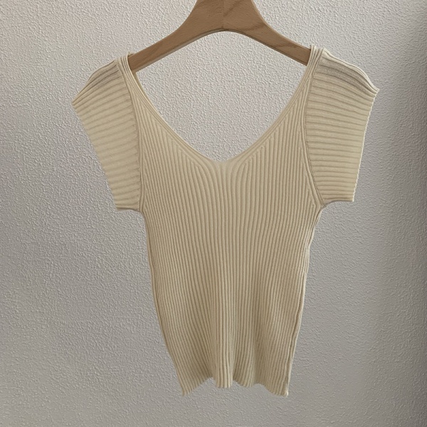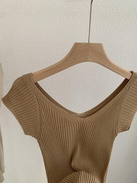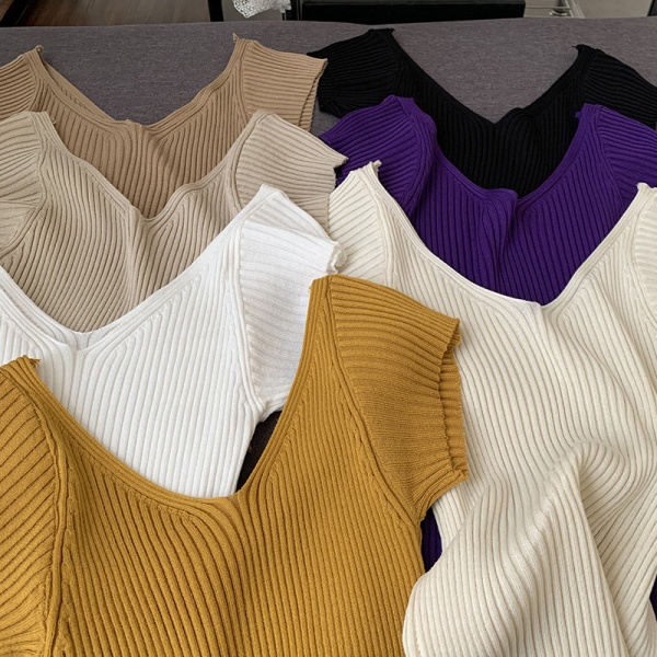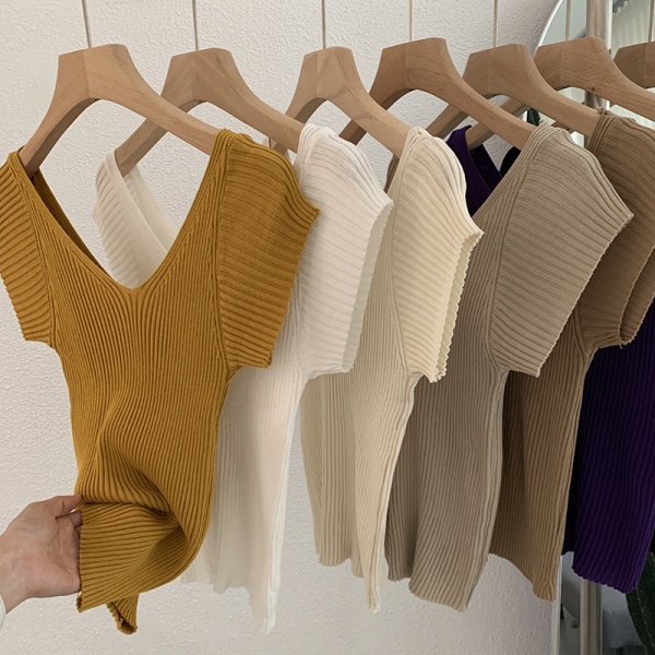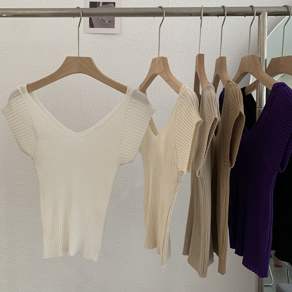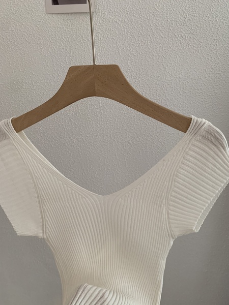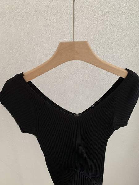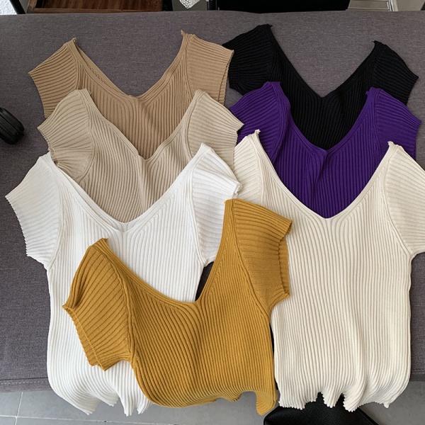 欧玛莱 纯欲风夏季时尚双V领短袖纯色修身显瘦针织衫上衣批发3215