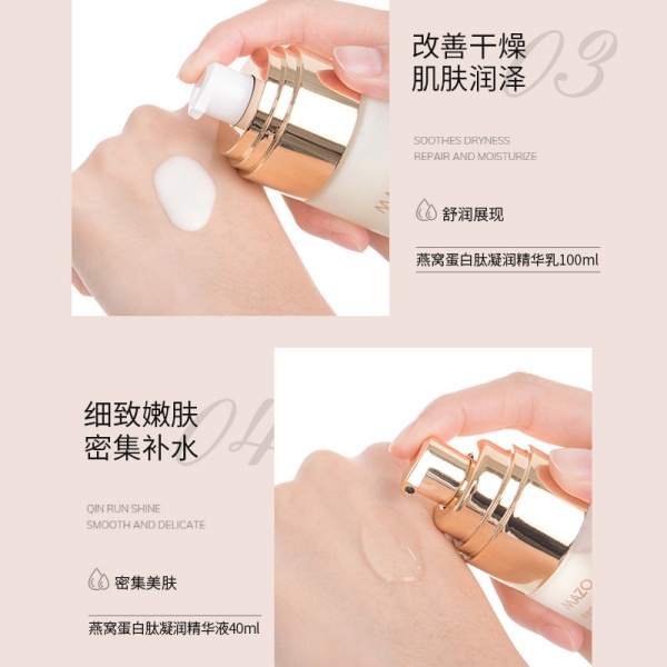 商品属性 [主要下游平台] 亚马逊,wish,速卖通,LAZADA [产品名称] MAZO燕窝蛋白肽凝润水乳套装 [产地] 广东 [保质期] 3年 [化妆品功效] 控油,其他功效,补水保湿,提亮肤色,滋润,柔润肌肤 [品牌类型] 精品国货 [是否跨境出口专供货源] 是 [是否进口] 否 [有可授权的自有品牌] 是 [特殊用途化妆品] 否 [生产许可证号] 粤妆20170506 [适用人群] 普通人群 [非特化妆品备案证号] 粤G妆网备字2019254078