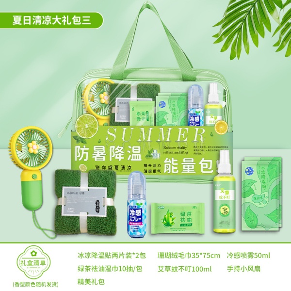 商品属性 [1] 夏日礼品 [2] 夏日清凉套装 [3] 夏日清凉包 [是否IP授权] 否 [是否专利货源] 否 [是否属于礼品] 是,个人礼品 [有可授权的自有品牌] 否 [材质] 纸 [类别] 商务礼品套装 [送礼用途] 积分换购礼品,商务礼品,广告礼品,促销赠品,会议礼品,福利礼品,节庆礼品,嘉奖纪念,公关礼品,其他 [适用节日] 通用,其他 [适用送礼关系] 晚辈,情侣,夫妻,同事,朋友,长辈,同学,恩师,其他 [适用送礼场合] 生日,毕业,其他 [风格] 现代简约