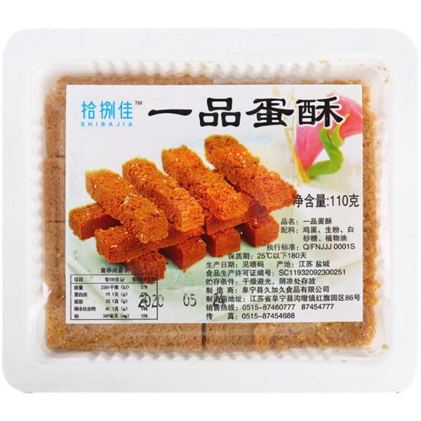 商品属性 [产品标准号] Q/FNJJJ0001S [产品类别] 蛋酥 [保质期] 180天 [储存条件] 常温 [储藏方法] 25°C以下 [净含量(规格)] 110g [包装方式] 简装系列 [原产地] 盐城 [原料与配料] 鸡蛋 白砂糖 植物油 玉米淀粉 [商品条形码] 69311448603508 [是否含糖] 含糖 [是否进口] 否 [热卖月份] 全年 [特产品类] 其他 [生产厂家] 阜宁县久加久食品有限公司 [生产许可证编号] SC11932092300251 [类型] 传统糕点