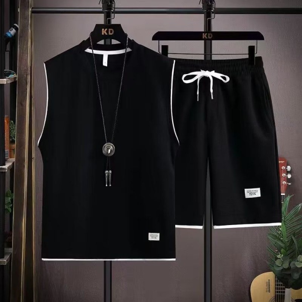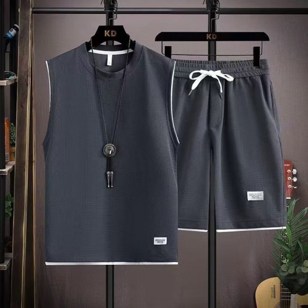 夏季男士宽松短袖华夫格休闲背心短袖假两件两件套运动短裤套装潮