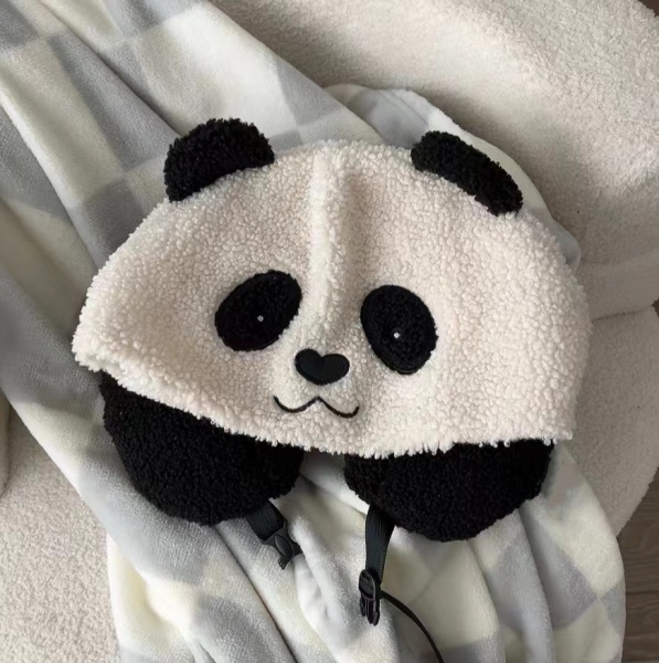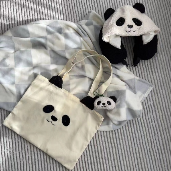 24新品熊猫旅行小憩套装法兰绒毛毯帆布袋挂件带帽颈枕四件套