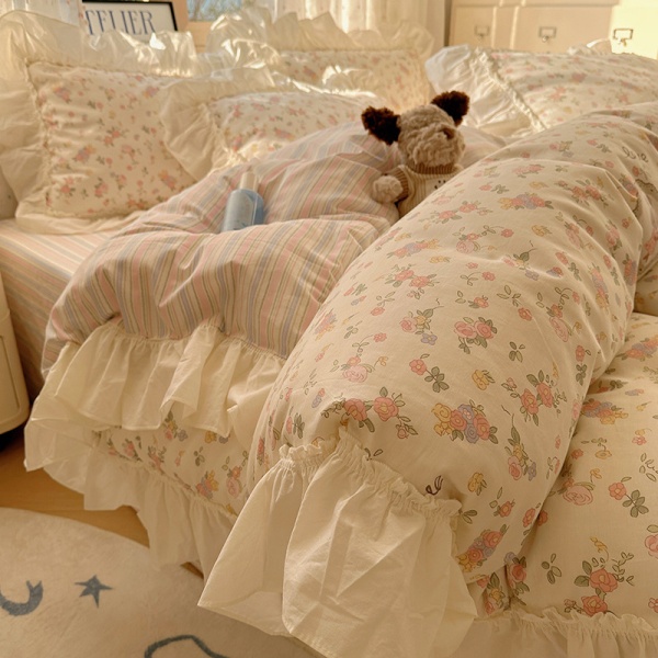 商品属性 [克重] 500g(含)~800g(不含) [加工定制] 否 [印染工艺] 活性印染 [图案] 条纹,纯色,几何图案,千鸟格,抽象画,卡通动漫,植物花卉,萌趣动物 [是否一般纳税人] 否 [材质] 纯棉 [款式] 床笠式 [法式复古风四件套] 少女心四件套 [织造工艺] 花边,印花 [面料密度] 其他/other [面料支数] 40支 [韩式四件套] 床上用品四件套 [风格] 法式