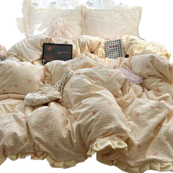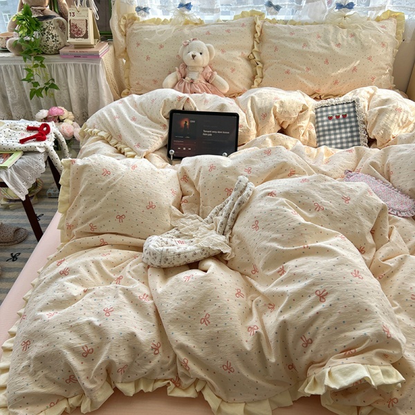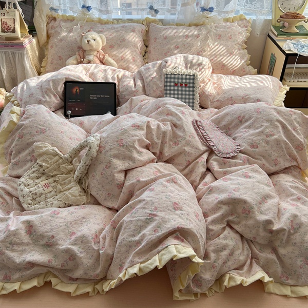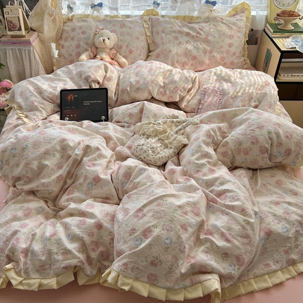 商品属性 [克重] 2000g(含)~2500g(不含) [加工定制] 否 [印染工艺] 活性印染 [图案] 植物花卉 [是否一般纳税人] 是 [材质] 皱皱纱 [款式] 床单式 [织造工艺] 花边,褶皱 [风格] ins风