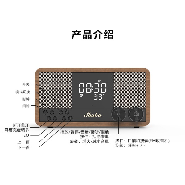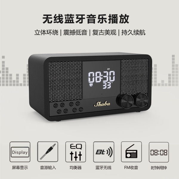 商品属性 [上市时间] 2024 [主要下游平台] ebay,亚马逊,wish,速卖通,独立站,LAZADA [主要销售地区] 南美,东南亚,北美,中东,欧美,其他 [产品净重] 894克 [信噪比] 60dB以下 [内置蓄电池容量] 1200mAh-2000mAh(含) [包装清单] 彩盒+说明书+充电线 [售后服务] 店铺三包 [喇叭数] 2个 [外观尺寸] 234x115x119 [是否专利货源] 否 [是否内置电池] 内置电池 [是否外贸] 是(本商品仅供外贸用途,可能不符合境内产品标准。请境内买家谨慎购入。) [是否跨境出口专供货源] 是 [有效距离] 15米 [电源方式] USB [箱体材质] ABS+MDF [蓝牙版本] 5.1 [认证类型] ce,FCC,ROHS,CQC [连接方式] 蓝牙连接 [适用场景] 桌面,健身运动,户外,居家,移动便携,直播,广场舞,广播系统 [防水等级] 不防水 [附加功能] 插卡,闹钟,通话功能 [频响范围] 60Hz-15KHz [额定功率] 5W [额定电压] 5V