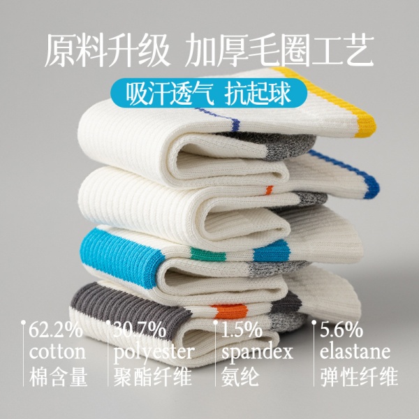 商品属性 [上市年份/季节] 2024年夏季 [上市时间] 2024年夏季 [主面料成分] 棉 [主面料成分含量] 90%(含)-95%(不含) [产品类别] 普通休闲袜 [产地] 诸暨 [功能] 防滑,抗菌,吸汗,防臭 [包装形式] 无包装 [图案] 拼色 [成分及含量] 90 [无骨缝制] 否:机器缝头 [是否跨境出口专供货源] 是 [是否进口] 否 [筒高] 高筒 [织造方法] 双针 [适合季节] 夏季,冬季,春季,秋季,四季通用 [适用年龄段] 青年(18-40周岁) [适用性别] 男 [针数] 200N [面料名称] 棉 [风格] 运动