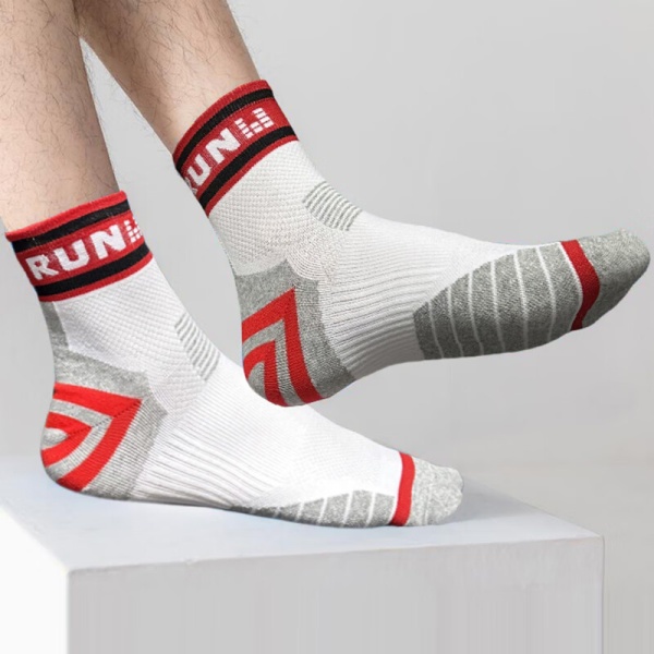 这款袜子采用棉+尼龙混合材料制造,底部是比较厚的棉,可以有效吸汗,防臭,避免剧烈运动汗水打滑,上体位置用尼龙透气网眼,在运动中,可以快速排汗,最大限度保持脚部干爽。袜子全身带橡筋包裹,保证剧烈运动不滑动。