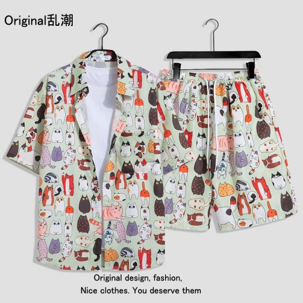 夏威夷沙滩度假风短袖套装男女学生宽松情侣短裤花衬衣休闲两件套