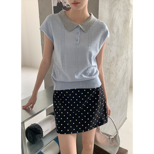商品属性 [上市年份/季节] 2025年春季 [主面料成分] 腈纶 [主面料成分含量] 30%(含)-50%(不含) [厚薄] 薄 [图案] 纯色 [工艺] 免烫处理 [是否跨境货源] 否 [款式] 无袖款 [流行元素] 纯色 [版型] 常规 [穿着方式] 套头 [组合形式] 单件 [衣长] 普通款(50cm<衣长≤65cm) [袖型] 飞飞袖 [袖长] 无袖 [门襟] 套头 [面料名称] 39%涤纶;35%抗起球腈纶;20%锦纶;6%丝光羊毛 [领型] POLO领 [风格] 少女风 [风格类型] 清新甜美