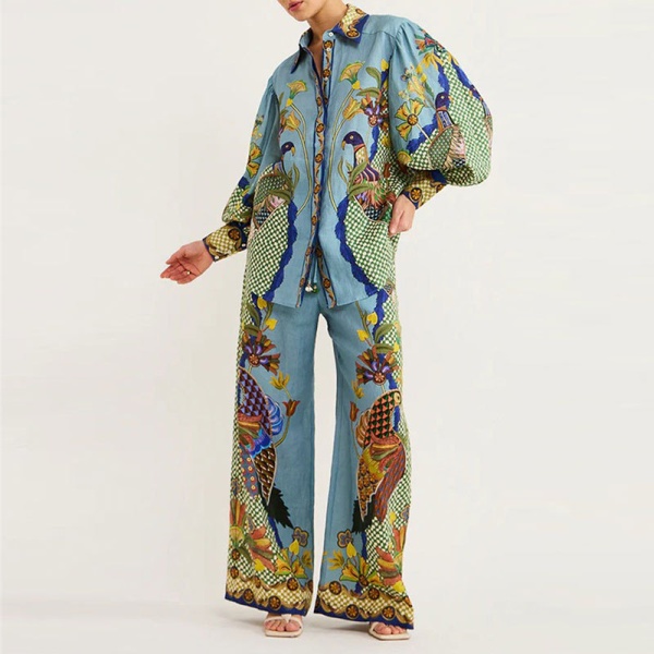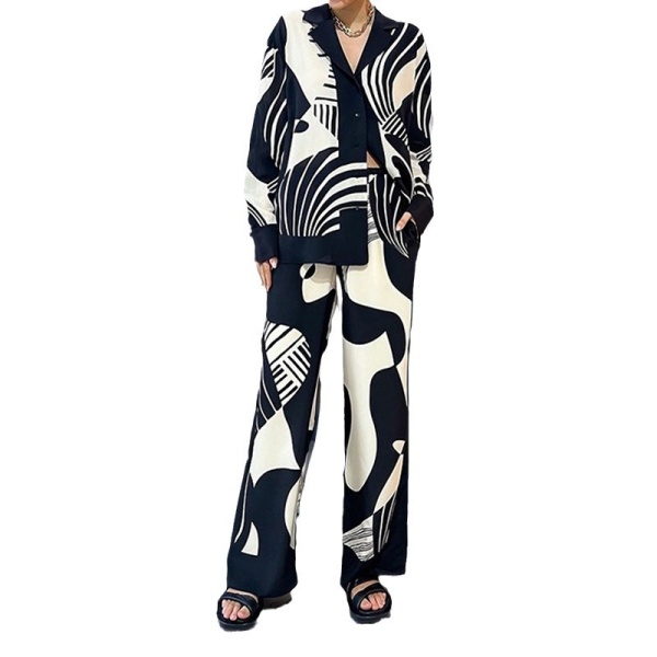 2025亚马逊欧美女装个性涂鸦休闲衬衫女翻领长袖时尚套装女俩件套