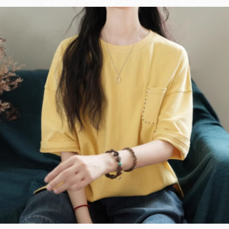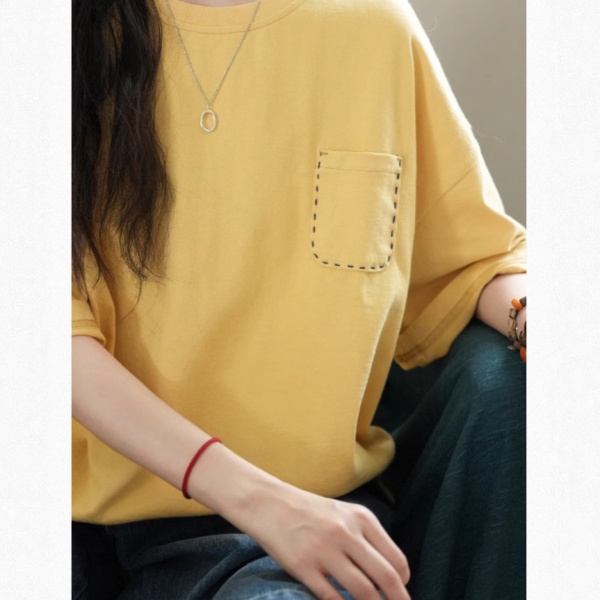 商品属性 [上市年份/季节] 2025夏季 [主面料成分] 棉 [主面料成分含量] 95%及以上 [图案] 纯色 [工艺] 刺绣/绣花 [是否跨境货源] 否 [款式] 套头 [流行元素] 口袋 [版型] 宽松型 [衣长] 普通款(50cm<衣长≤65cm) [袖型] 常规 [袖长] 短袖 [面料名称] 棉 [领型] 圆领 [风格] 通勤风 [风格类型] 气质通勤