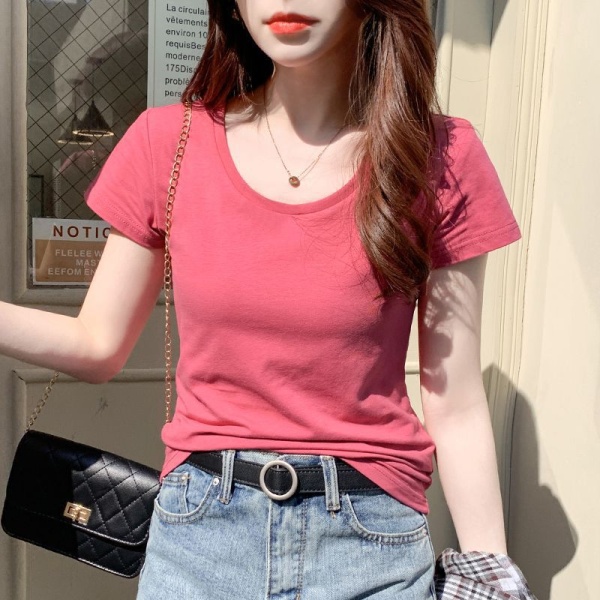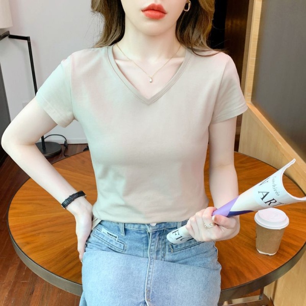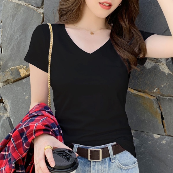 批发修身短袖t恤女v领黑色上衣女鸡心领夏季2024年新款设计感夏装