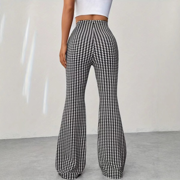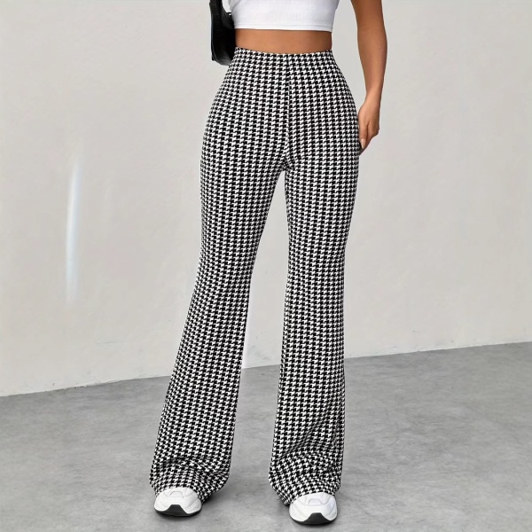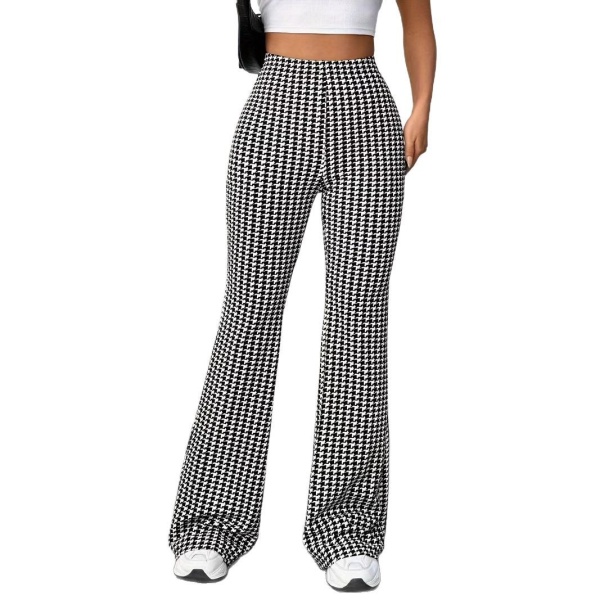 跨境亚马逊弹力休闲裤 运动黑白千鸟格女士裤 气质通勤舒适微喇裤