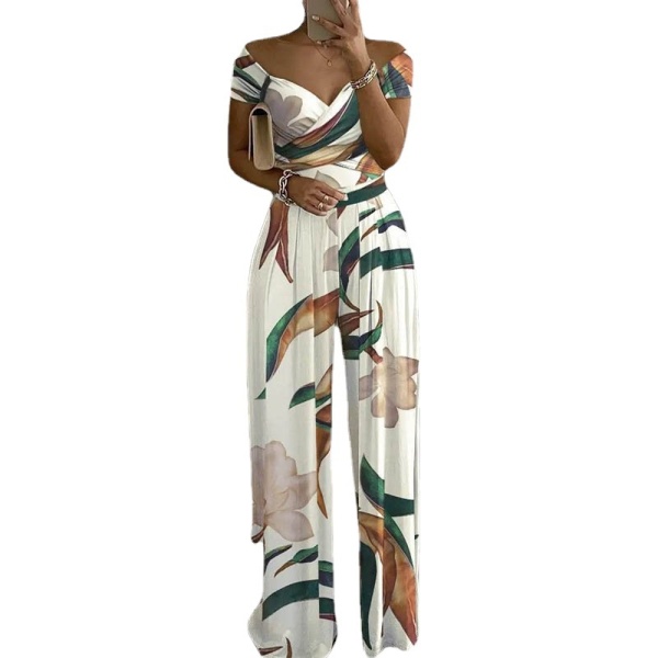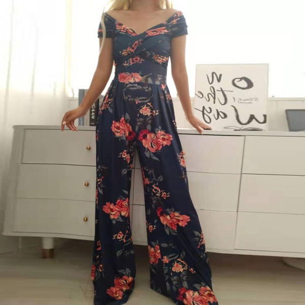 2025新款亚马逊速卖通欧美通勤女装一字肩印花长裤性感高腰连体裤