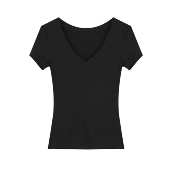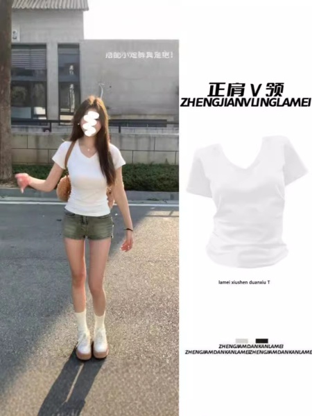 新款正肩v领短袖T恤女夏季2024新款内搭修身显瘦百搭辣妹短款上衣