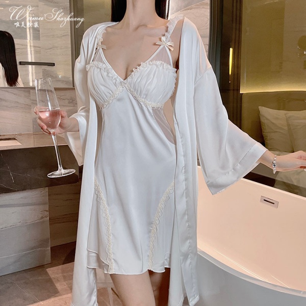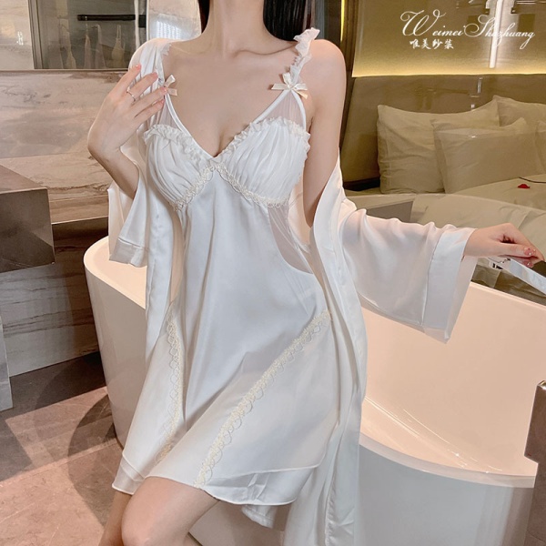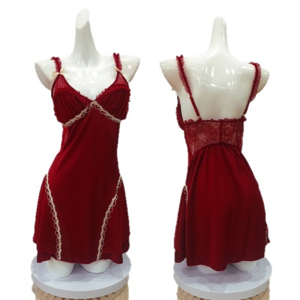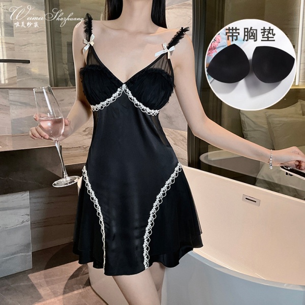 唯美纱木耳花边吊带睡裙家居性感睡裙套装缎面拼纱透气纯欲睡衣