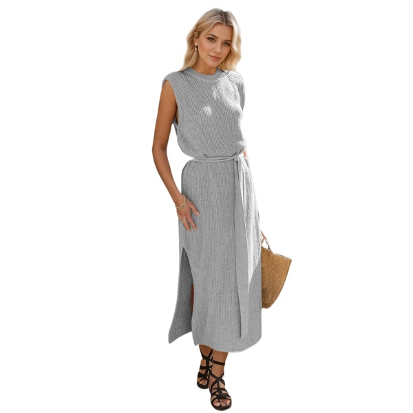 商品属性 [上市年份/季节] 2025夏季 [主要下游销售地区1] 欧美 [主要下游销售地区2] 欧美 [主面料成分] 腈纶 [主面料成分含量] 95%及以上 [产地] 汕头 [图案] 纯色 [工艺] 纯色 [是否跨境货源] 是 [款式] 套头 [流行元素] 开叉 [组合形式] 单件 [腰型] 宽松腰 [袖型] 无袖 [袖长] 无袖 [裙型] A字裙 [裙长] 长裙 [跨境风格类型] 个性街头 [门襟] 系带 [面料名称] 针织 [领型] 圆领 [风格] 欧美风 [风格类型] 街头潮人