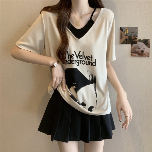 商品属性 [上市年份/季节] 2024年夏季 [主要下游销售地区1] 东南亚 [主要下游销售地区2] 欧美 [主面料成分] 涤纶(聚酯纤维) [主面料成分含量] 95%及以上 [图案] 几何图案 [工艺] 拼贴/拼接 [是否跨境货源] 是 [款式] 假两件套 [流行元素] 系带 [版型] 宽松型 [衣长] 普通款(50cm<衣长≤65cm) [袖型] 常规袖 [袖长] 短袖 [跨境风格类型] 甜美清新 [面料名称] 涤纶 [领型] V字领 [风格] 甜美风 [风格类型] 清新甜美