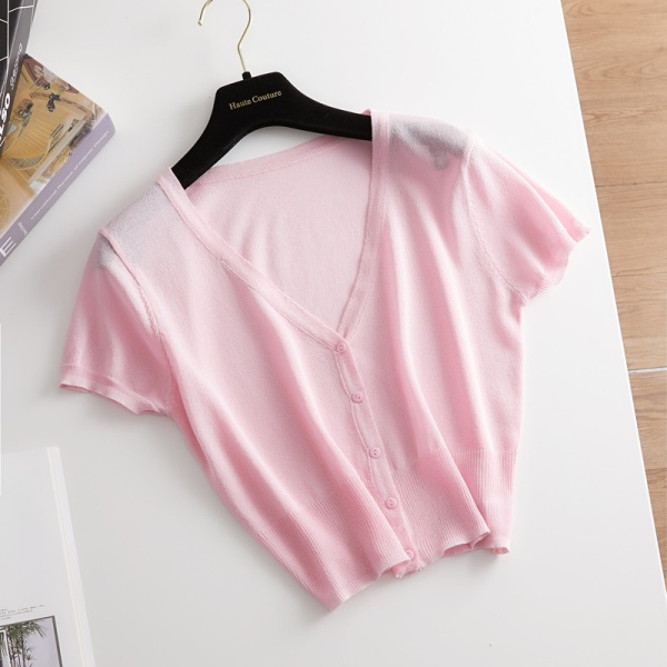 商品属性 [上市年份/季节] 2025夏季 [主面料成分的含量] 71%-80% [厚薄] 超薄 [图案] 纯色 [是否跨境货源] 否 [款式] 开衫 [版型] 直筒型 [袖型] 常规袖 [袖长] 三分袖 [门襟] 单排多扣 [面料名称] 粘胶 [领型] V字领 [风格] 甜美风 [风格类型] 清新甜美