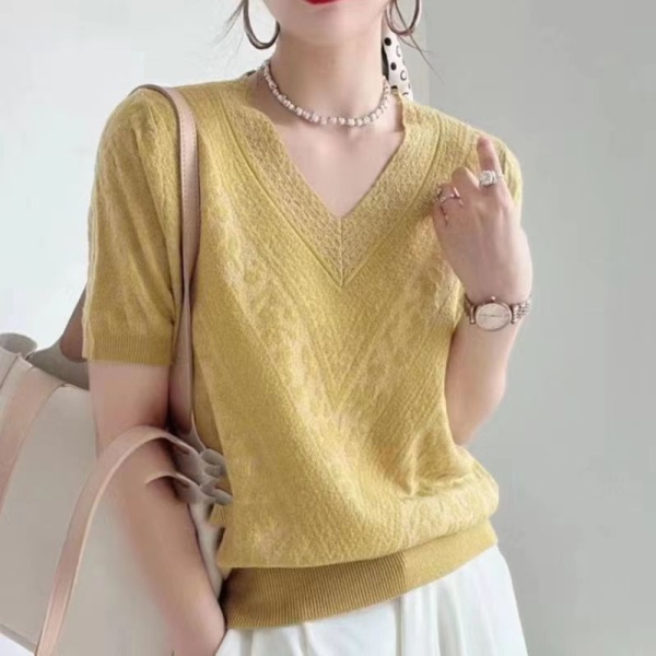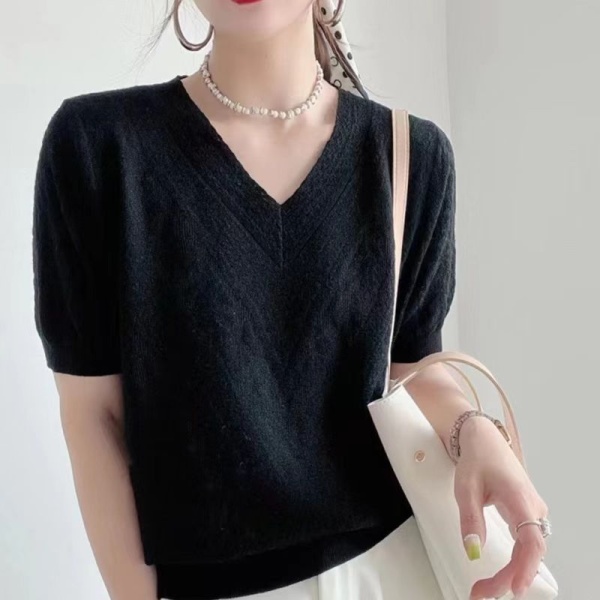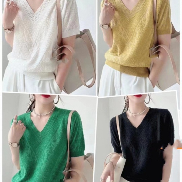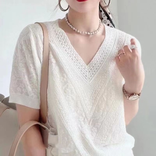 欧货设计感V领针织T恤女2024春夏新款百搭宽松时尚显瘦短袖针织衫