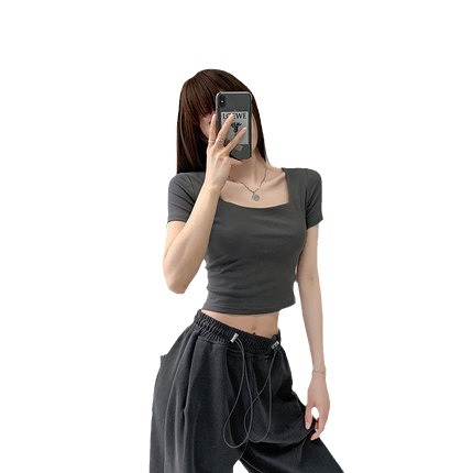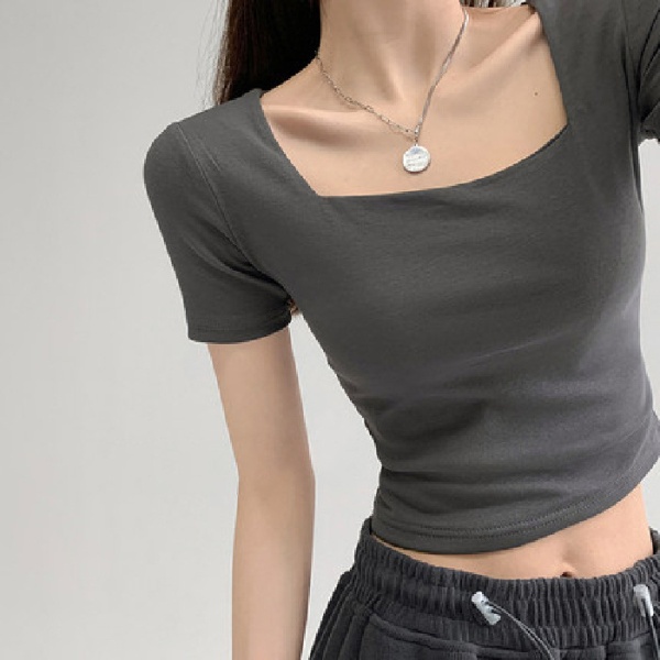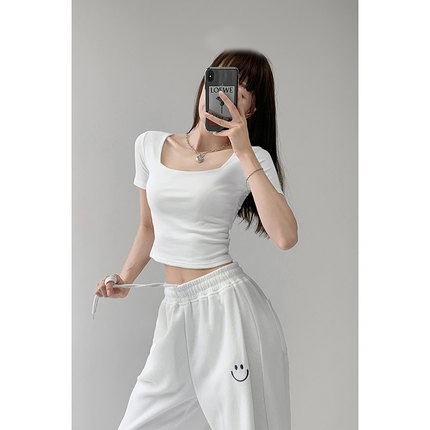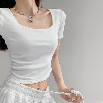 辣妹修身方领打底衫夏季短款纯欲露脐高腰T恤纯色显瘦短袖上衣女