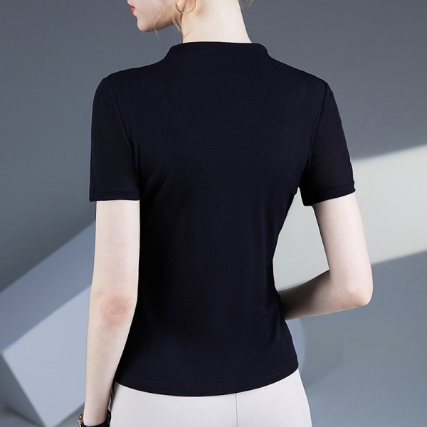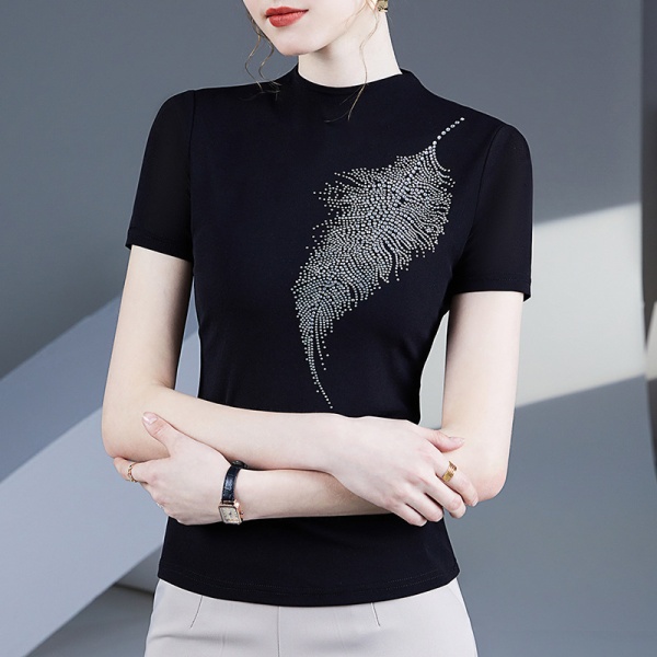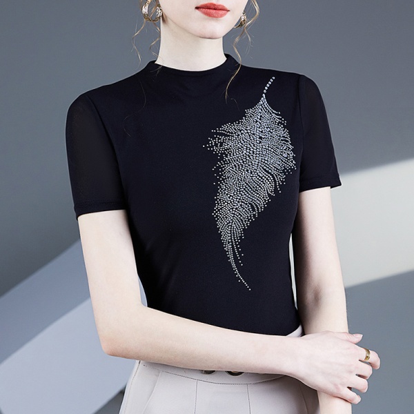 商品属性 [上市年份/季节] 2024年夏季 [主要下游销售地区1] 欧美 [主要下游销售地区2] 东南亚 [主面料成分] 锦纶 [主面料成分含量] 95%及以上 [工艺] 烫钻 [是否跨境货源] 是 [款式] 套头 [流行元素] 镶钻 [版型] 常规 [衣长] 普通款(50cm<衣长≤65cm) [袖型] 常规袖 [袖长] 短袖 [跨境风格类型] 舒适休闲 [面料名称] 网纱 [领型] 半高领 [风格] 优雅风 [风格类型] 气质通勤