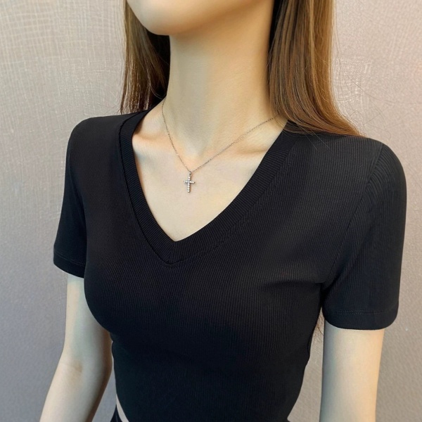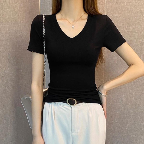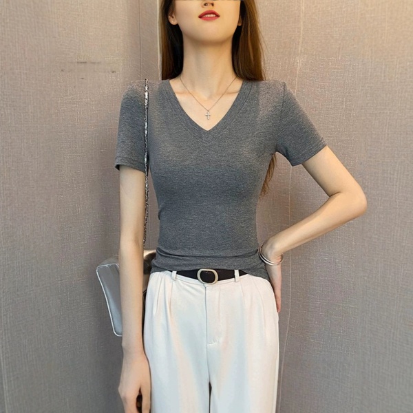 商品属性 [上市年份/季节] 2025年春季 [主面料成分] 粘胶纤维 [主面料成分含量] 95%及以上 [图案] 纯色 [是否跨境货源] 否 [版型] 修身型 [袖型] 常规袖 [袖长] 短袖 [面料名称] 粘胶纤维 [领型] V领 [风格] 通勤风 [风格类型] 气质通勤