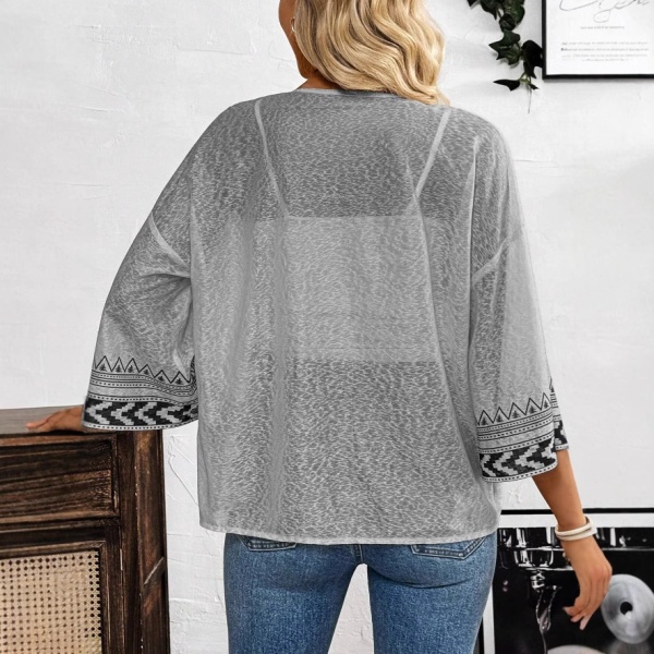 商品属性 [上市年份/季节] 2025年春季 [主面料成分] 再生纤维素纤维 [主面料成分2] 再生纤维素纤维 [主面料成分2含量] 30%以下 [主面料成分含量] 50%(含)-70%(不含) [图案] 印花 [工艺] 印花 [是否跨境货源] 否 [款式] 开衫 [流行元素] 印花 [版型] 宽松型 [衣长] 普通款(50cm<衣长≤65cm) [袖型] 常规袖 [袖长] 七分袖 [面料名称] 氨纶 [领型] 半开领 [风格] 优雅风 [风格类型] 气质通勤